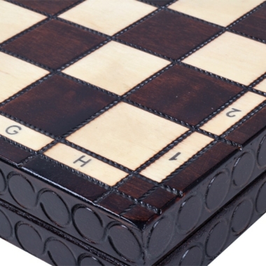Das Schachbrett umfasst ein Aufbewahrungsfach, das, wenn es geschlossen ist, das Schachspiel einfach transportierbar und leicht zu verstauen macht.