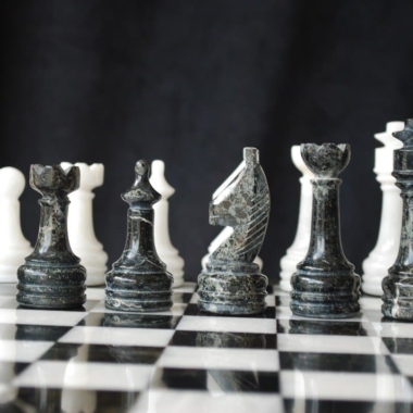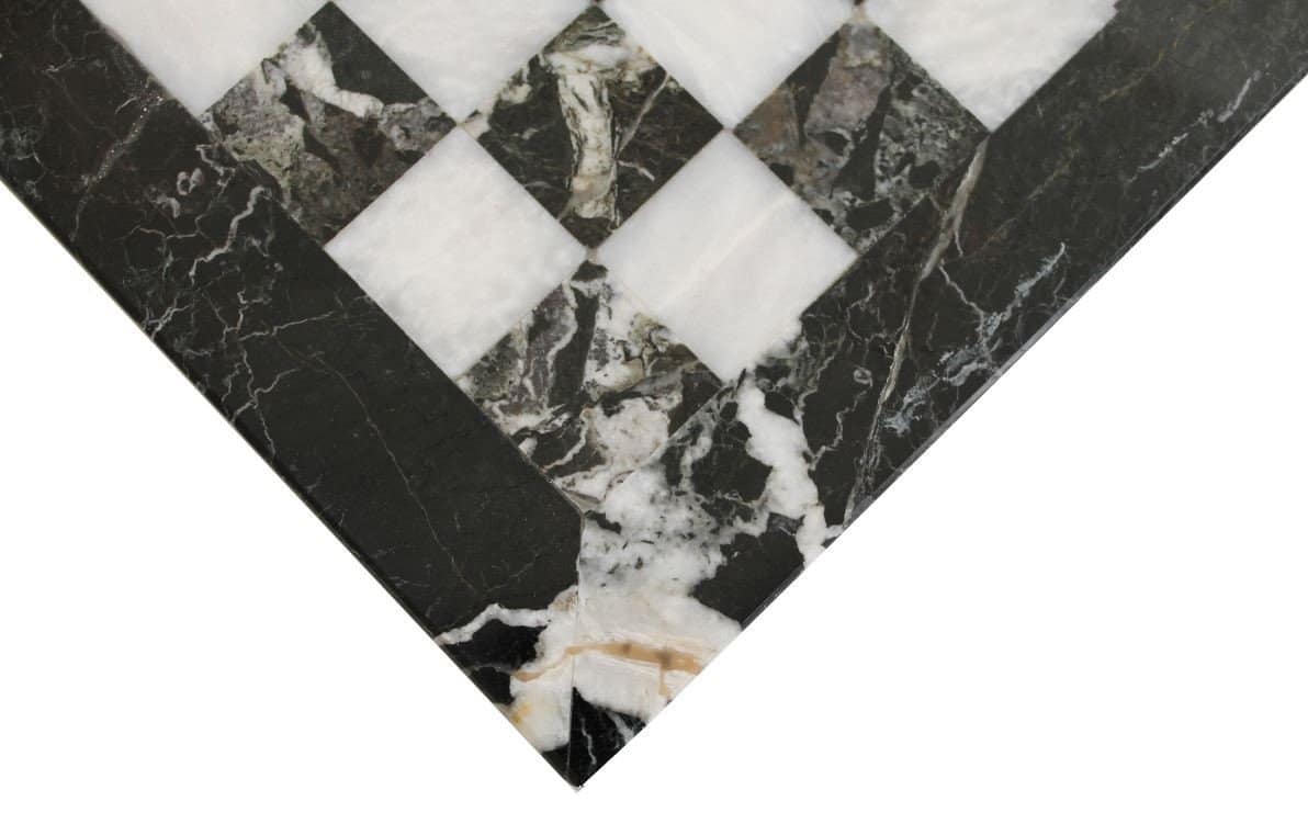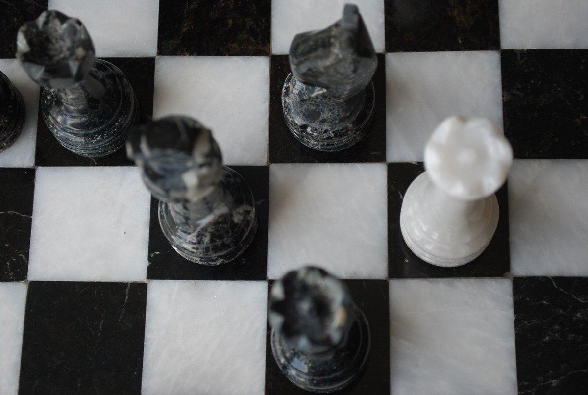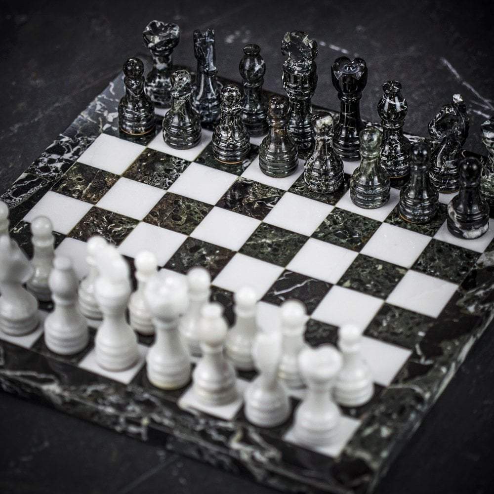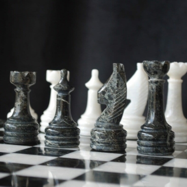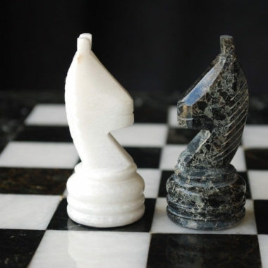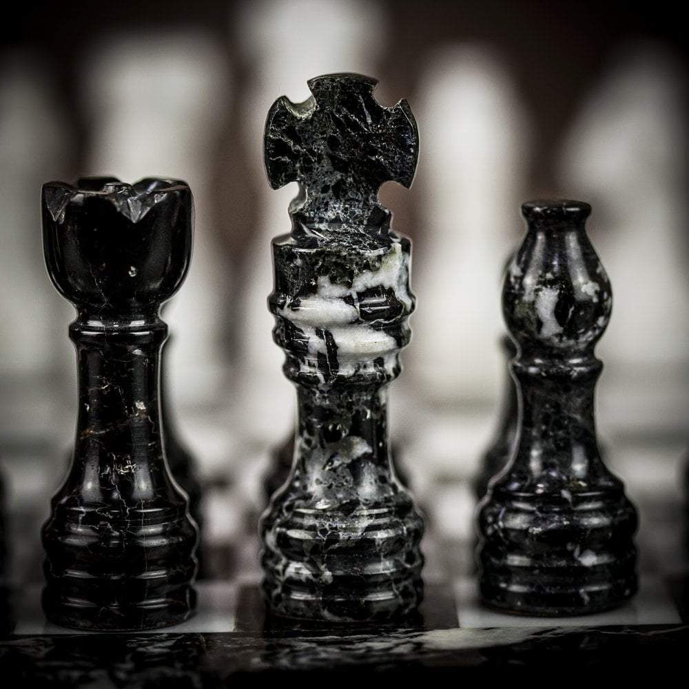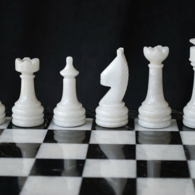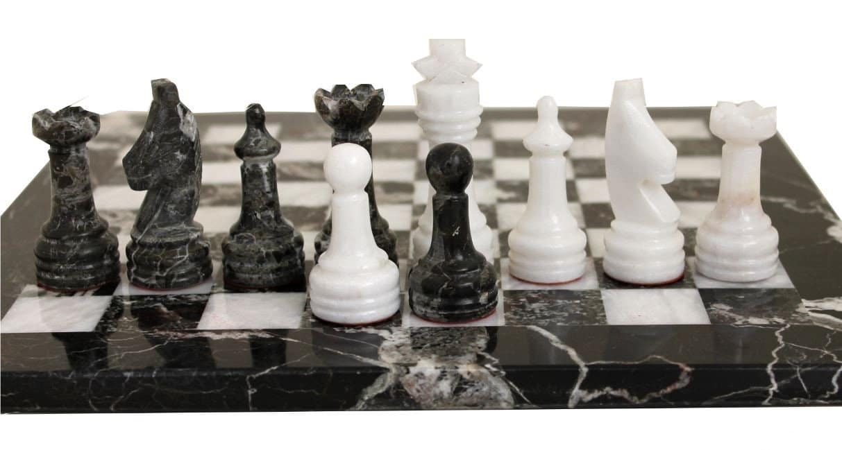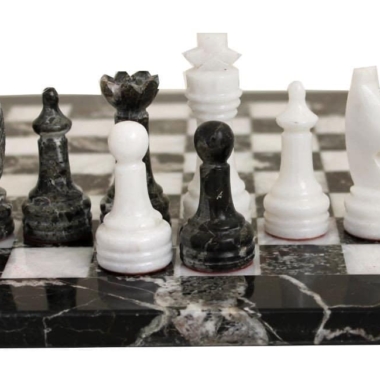 Ein Set aus Schachspiel, das vollständig aus Marmor gefertigt ist, die Schachfiguren im Staunton-Stil wurden handgeschnitzt und poliert, in Schwarz- und Weißtönen.