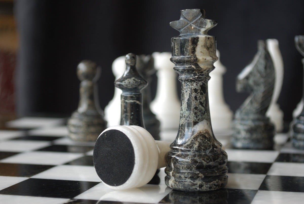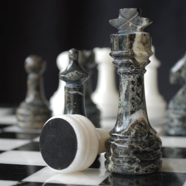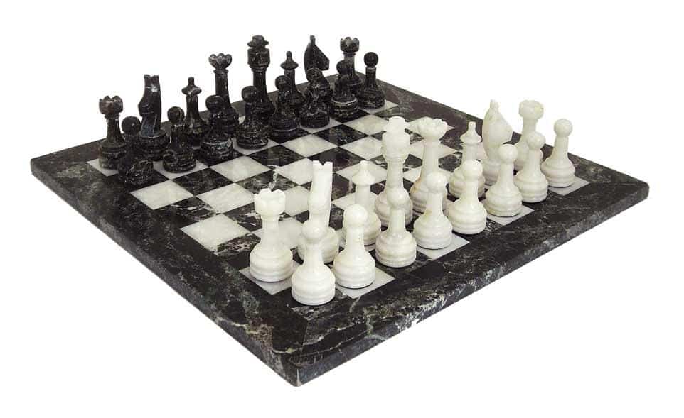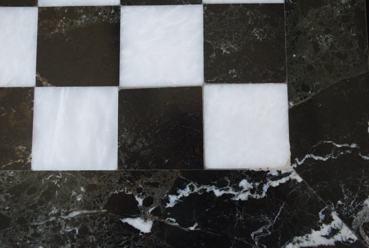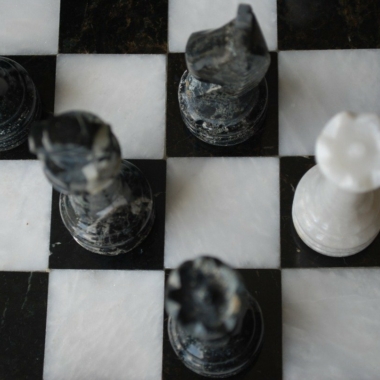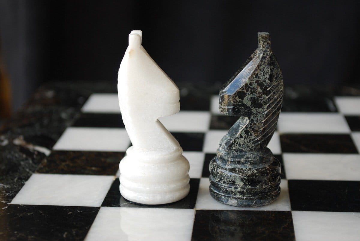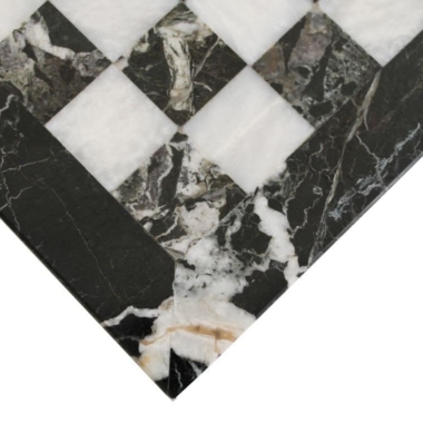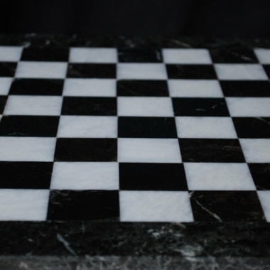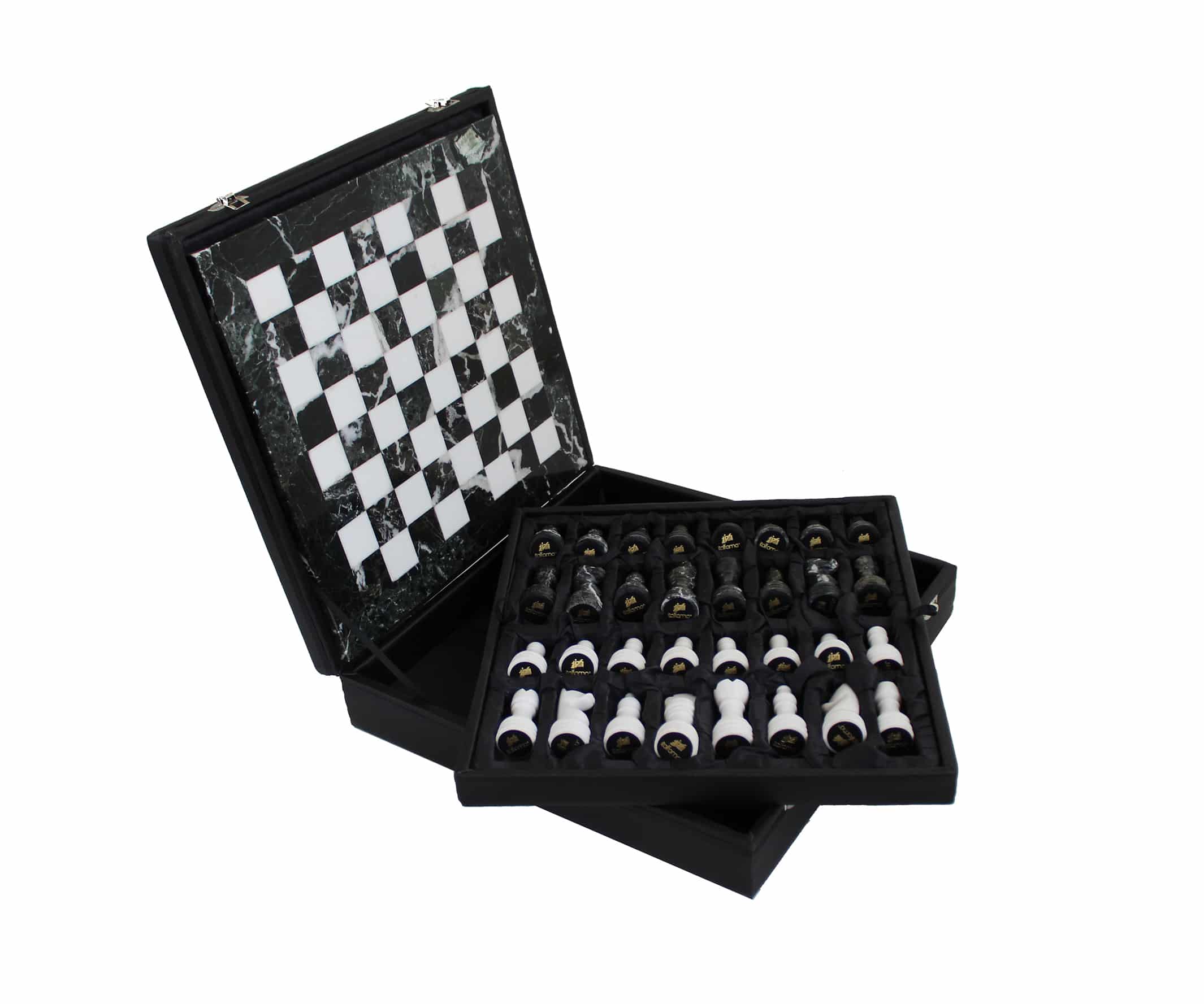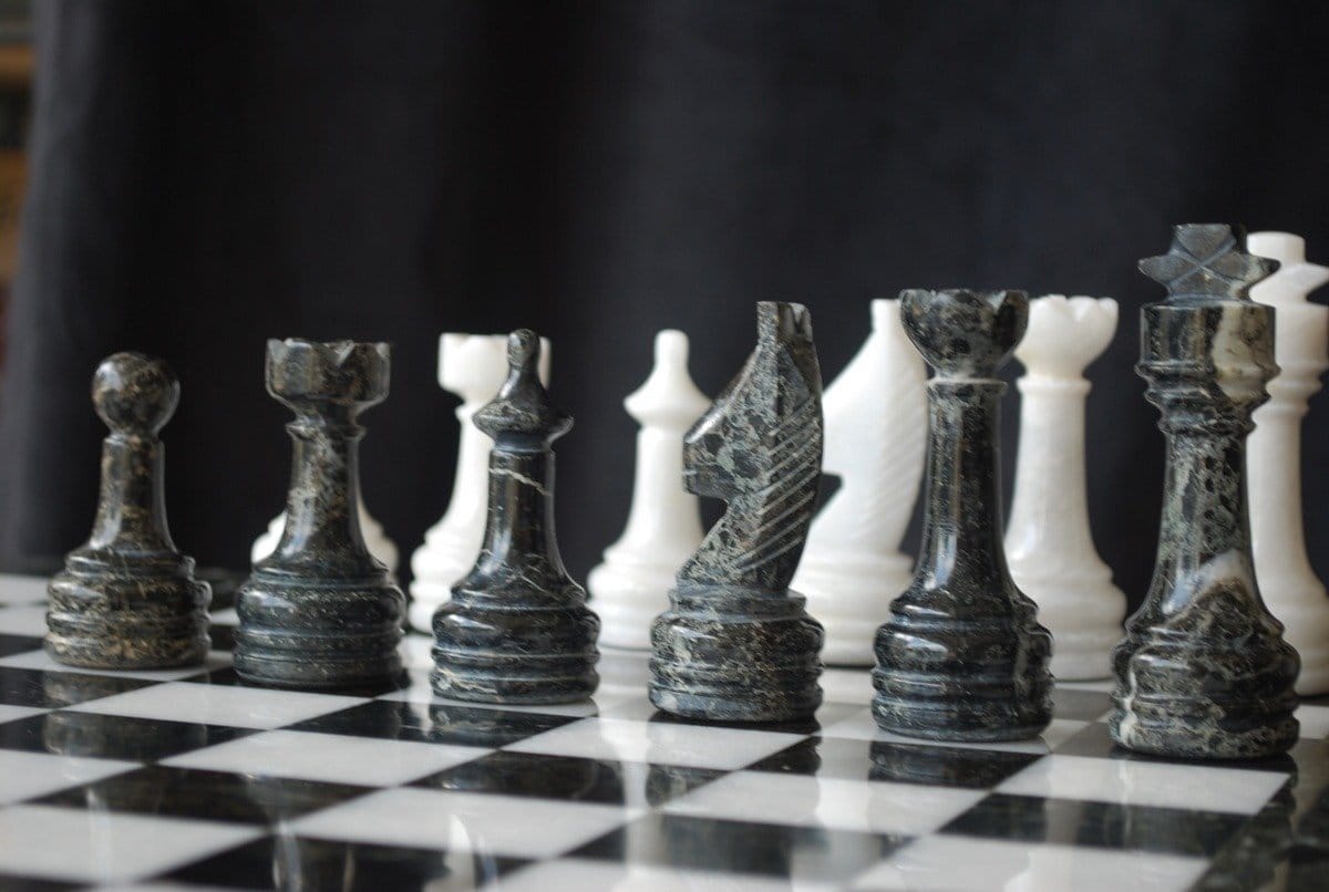 Ein Set aus Schachspiel, das vollständig aus Marmor gefertigt ist, die Schachfiguren im Staunton-Stil wurden handgeschnitzt und poliert, in Schwarz- und Weißtönen.