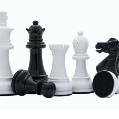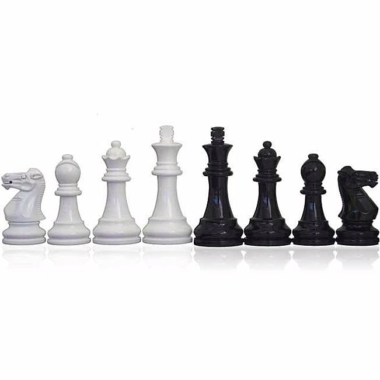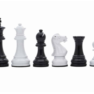 Zusammen mit dem Schachbrett finden sich Staunton-Schachfiguren aus lackiertem Schwarz und Weiß, die modern wirken, mit einer Höhe des Königs von 7,6 cm und perfekt zum schwarzen und weißen Schachbrett auf Fuß passen.