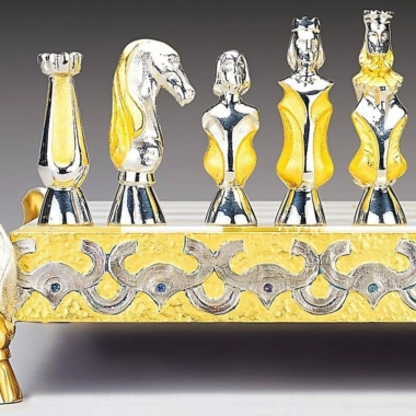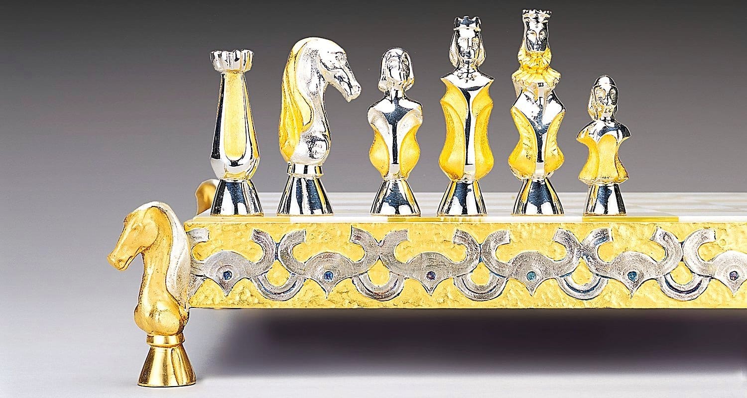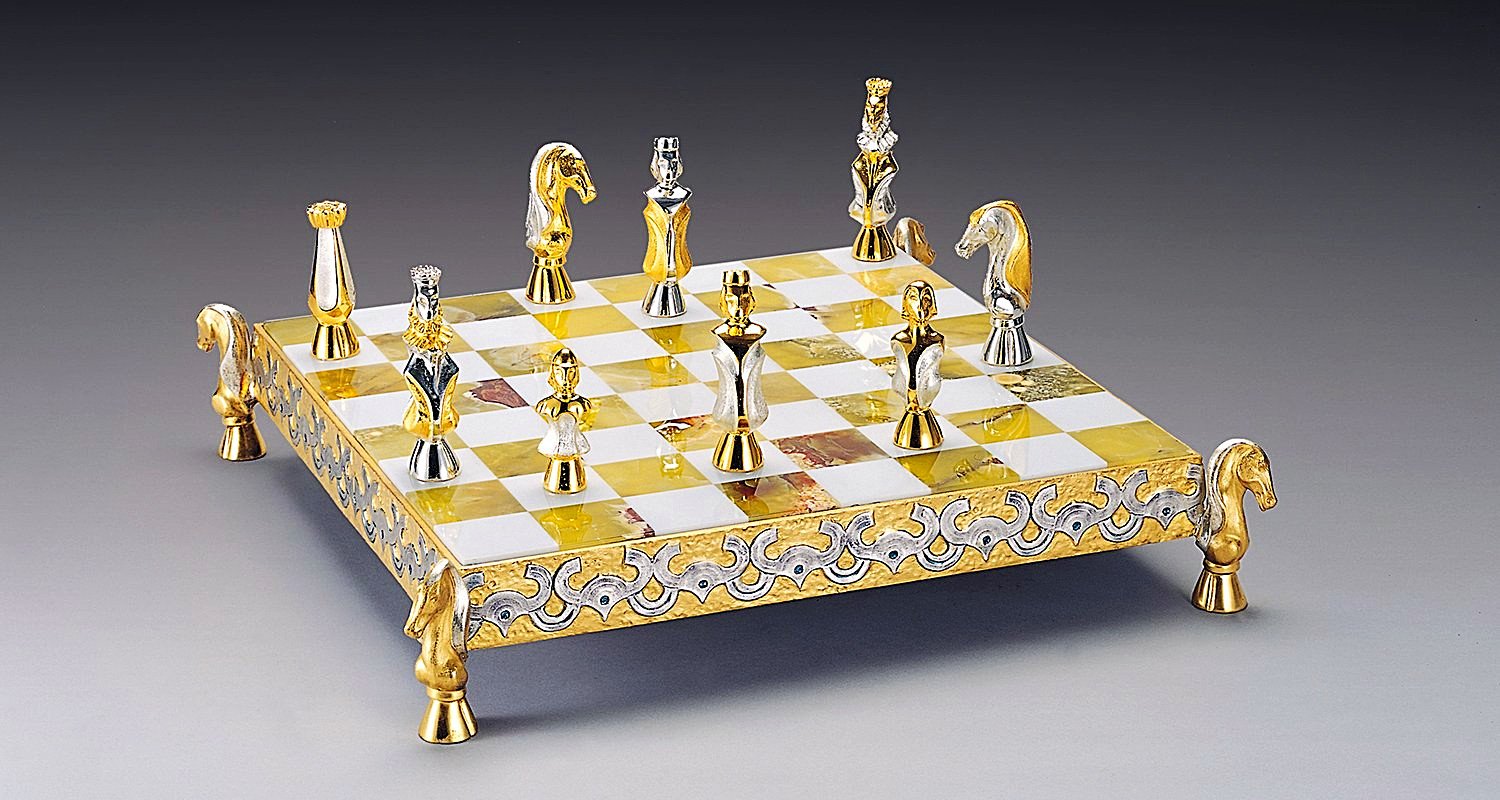 Oberfläche : 24 Karat Gold. Die Füße des Schachbretts sind in Form von Pferdekopf-Skulpturen gestaltet.