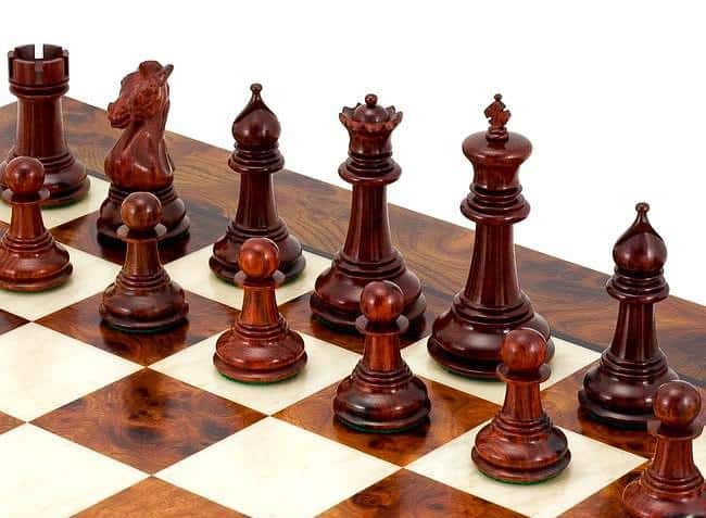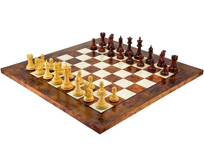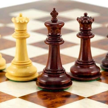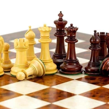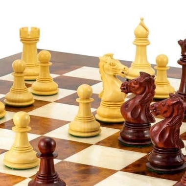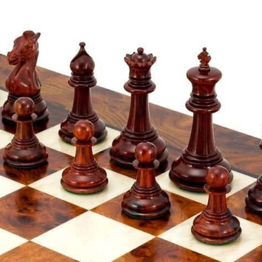 Ein wunderschönes Schachspiel, das beeindrucken wird! Das rote Sandelholz ist ein seltener Holztyp mit einer tiefroten Farbe, die perfekt zu den dunklen roten Knoten des Schachbretts passt.