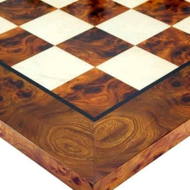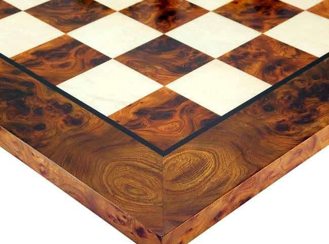 Das Schachbrett, das unser wunderschönes Schachspiel begleitet, ist aus Ulmen- und Heideholz geschnitzt. Die Qualität des Holzes und seine tiefen gelben und roten Farben sind wunderschön. Unter dem Schachbrett sind Filzpolster angebracht, um das Schachbrett und die Spieloberflächen zu schützen.