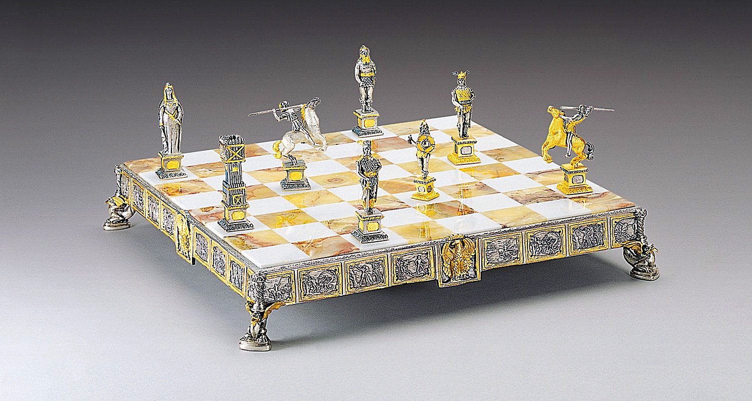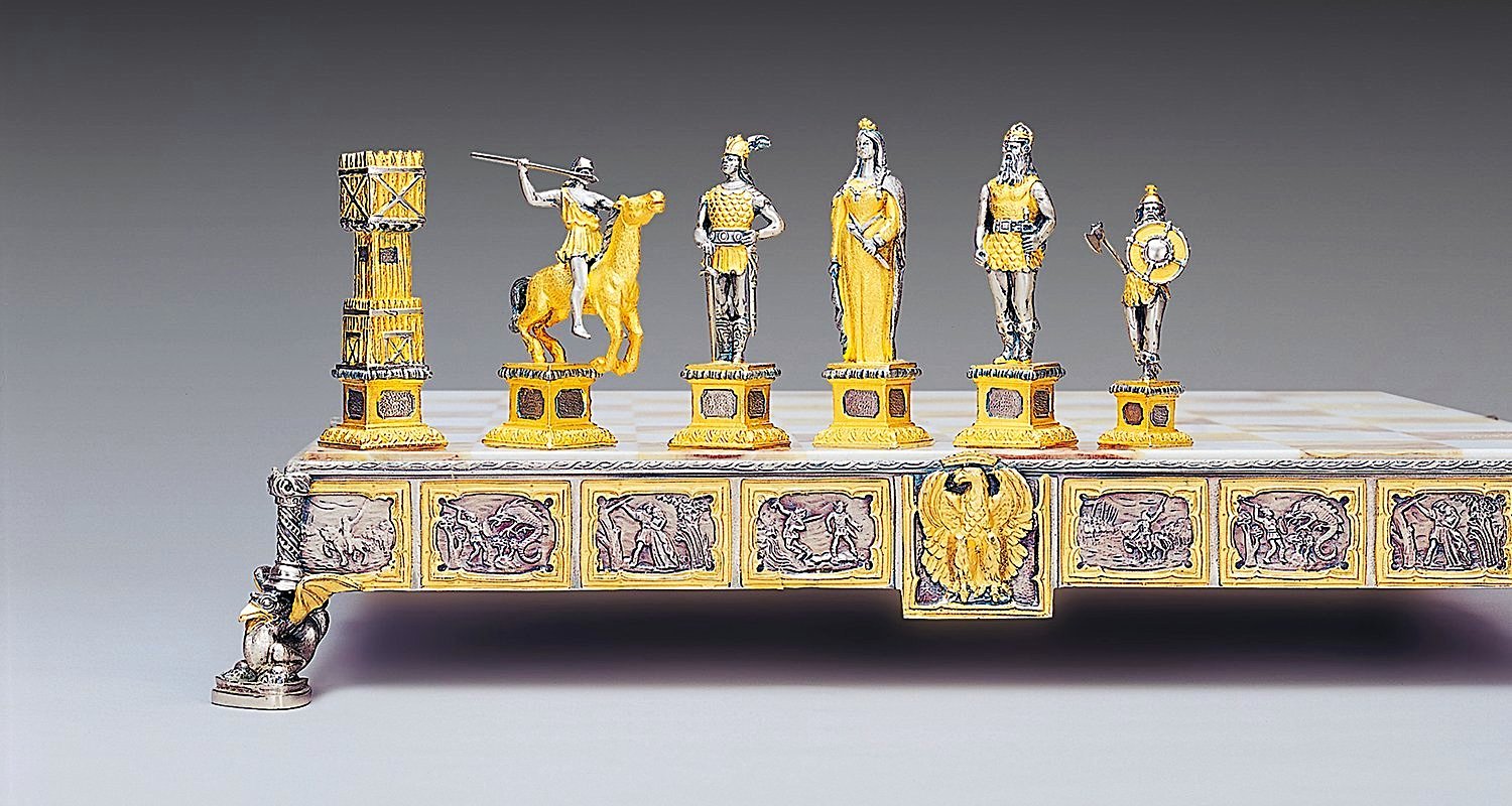 Die Schachfiguren sind dem Thema der Legende von Prinz Siegfried, dem Hüter des Schatzes der Nibelungen, gewidmet, um König Gunther zu helfen, die Hand von Brunehilde zu erobern. Sie sind aus Bronze mit einer 24-karätigen Goldoberfläche gefertigt.
