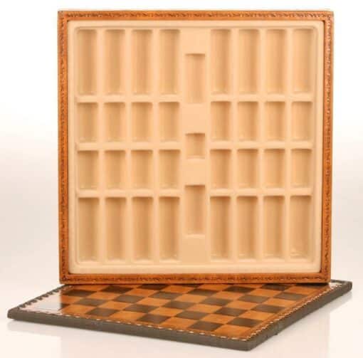 Das Schachbrett ist aus Kunstleder in Holzoptik gefertigt, wodurch die Schachfiguren besonders gut zur Geltung kommen, und profitiert von einem gefilzten Aufbewahrungsfach, das für jede Schachfigur individuellist.