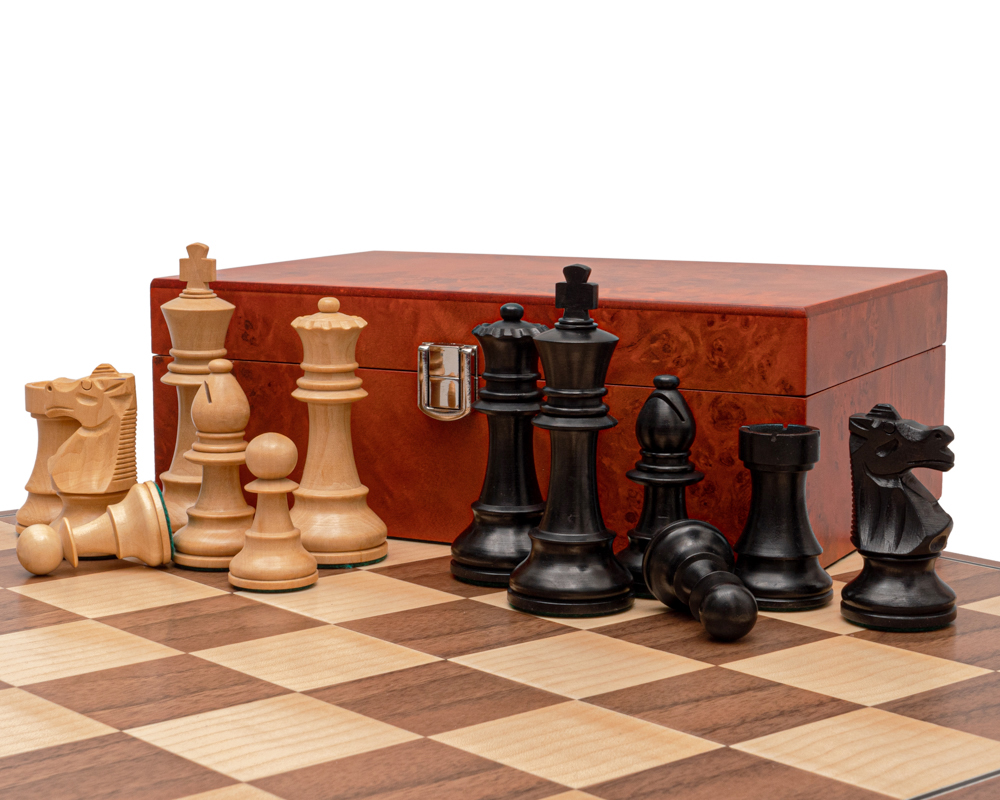 Das Conquest Schachset verkörpert die zeitlose Eleganz des Staunton Schachstils, bekannt für seine klassischen Linien und den Spielkomfort. Die Figuren sind handgeschnitzt aus massivem Buchenholz, mit einer tiefschwarzen Ebonisierung, die ihnen ein edles und raffiniertes Aussehen verleiht. Jede Figur ist beschwert und mit einem filzbezogenen Sockel ausgestattet, was eine hervorragende Stabilität gewährleistet und das Schachbrett schützt. Der majestätische König von 10,16 cm wird von zwei zusätzlichen Damen begleitet, ein Vorteil, den anspruchsvolle Spieler schätzen.