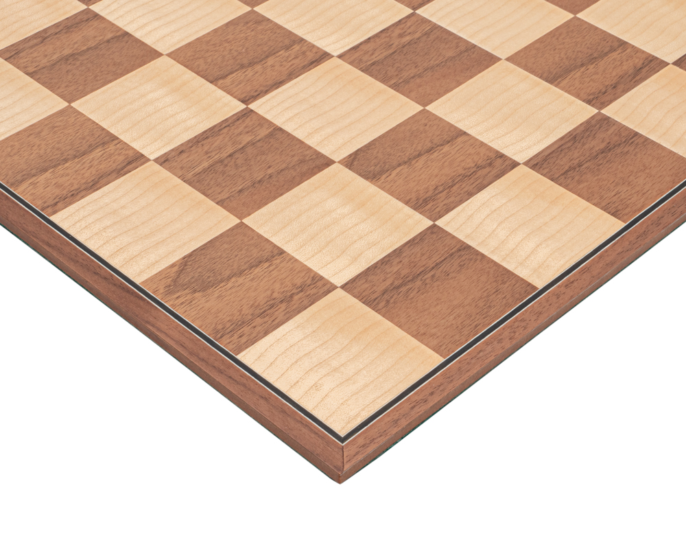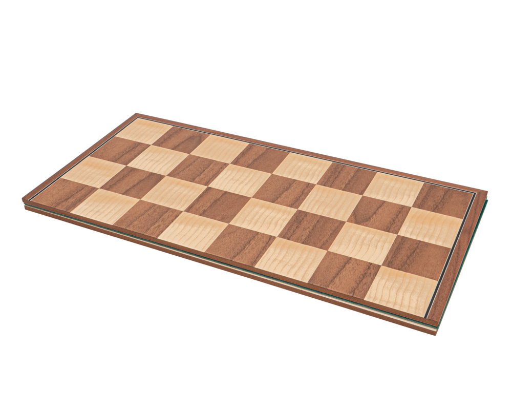 Das faltbare Schachbrett aus Nussbaum und Ahorn, mit den Maßen 42,5 x 42,5 cm und Felder von 4,8 cm, vereint Ästhetik und Praktikabilität. Sein schwarz lackierter Rand hebt die dunklen Figuren hervor und schafft einen eleganten visuellen Kontrast, während seine Billardfilzunterlage die Oberflächen effektiv schützt und eine hochwertige Verarbeitung gewährleistet.