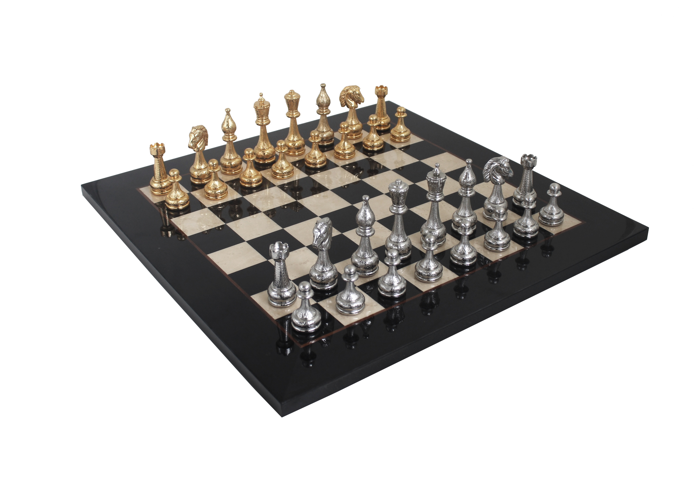 Staunton Schachfiguren aus vergoldetem und versilbertem Metall & Schachbrett aus lackiertem schwarzem Ahornholz