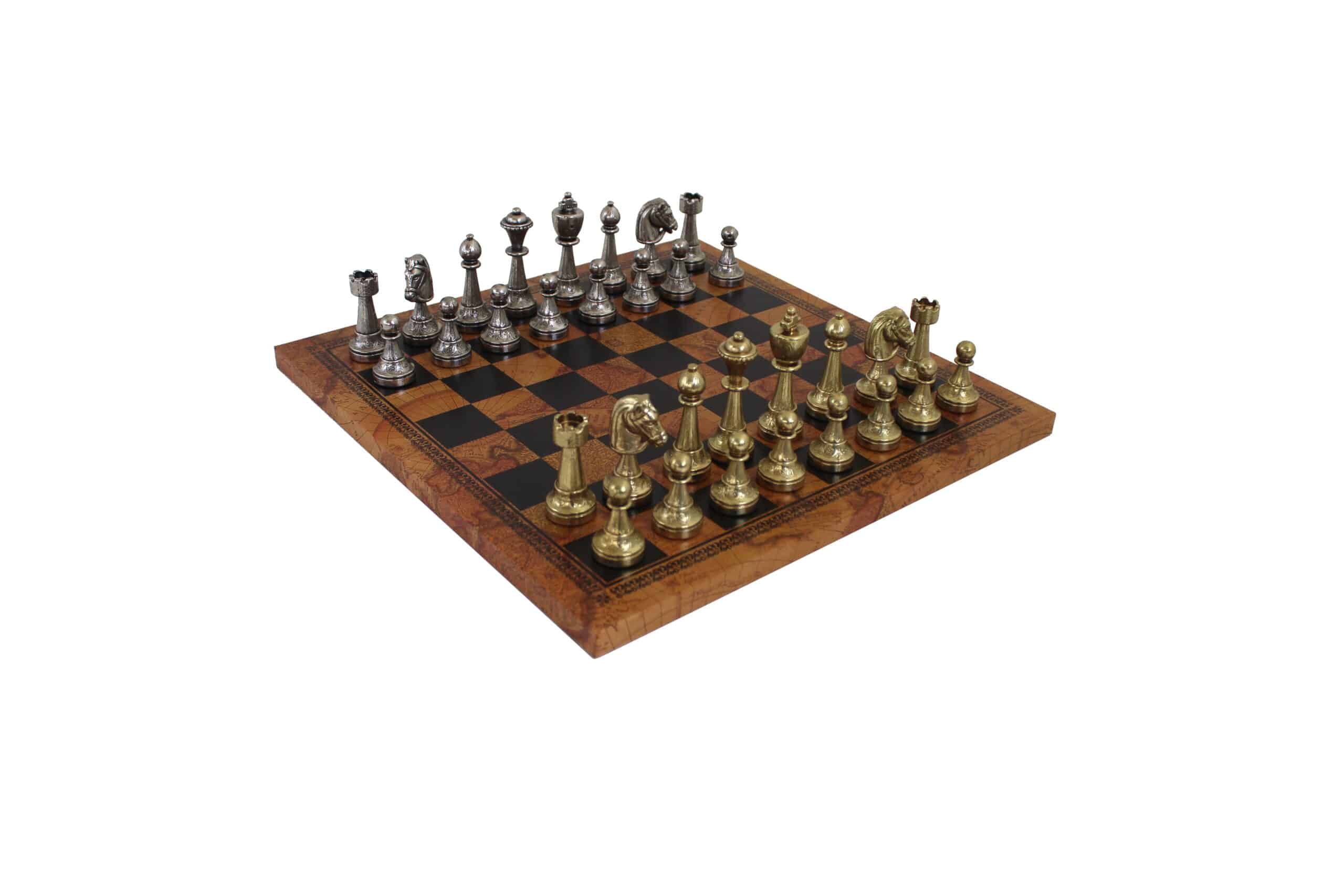 Sie sind kombiniert mit einem Schachbrett aus braunem Kunstleder aus Italien mit einer Größe von 33 x 33 cm. Das Spielbrett profitiert von einem Druck einer antiken Weltkarte.