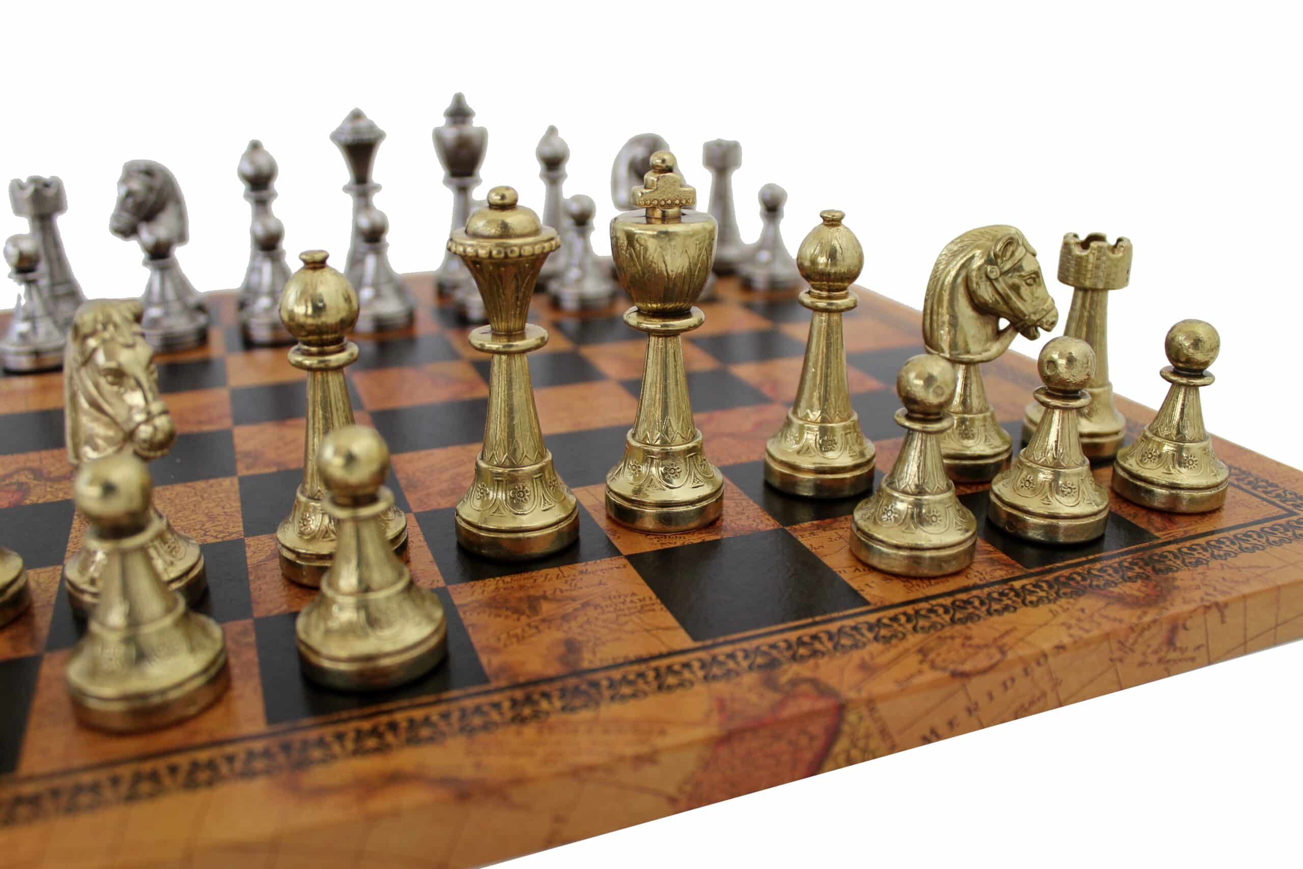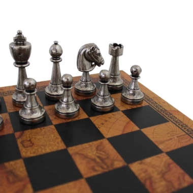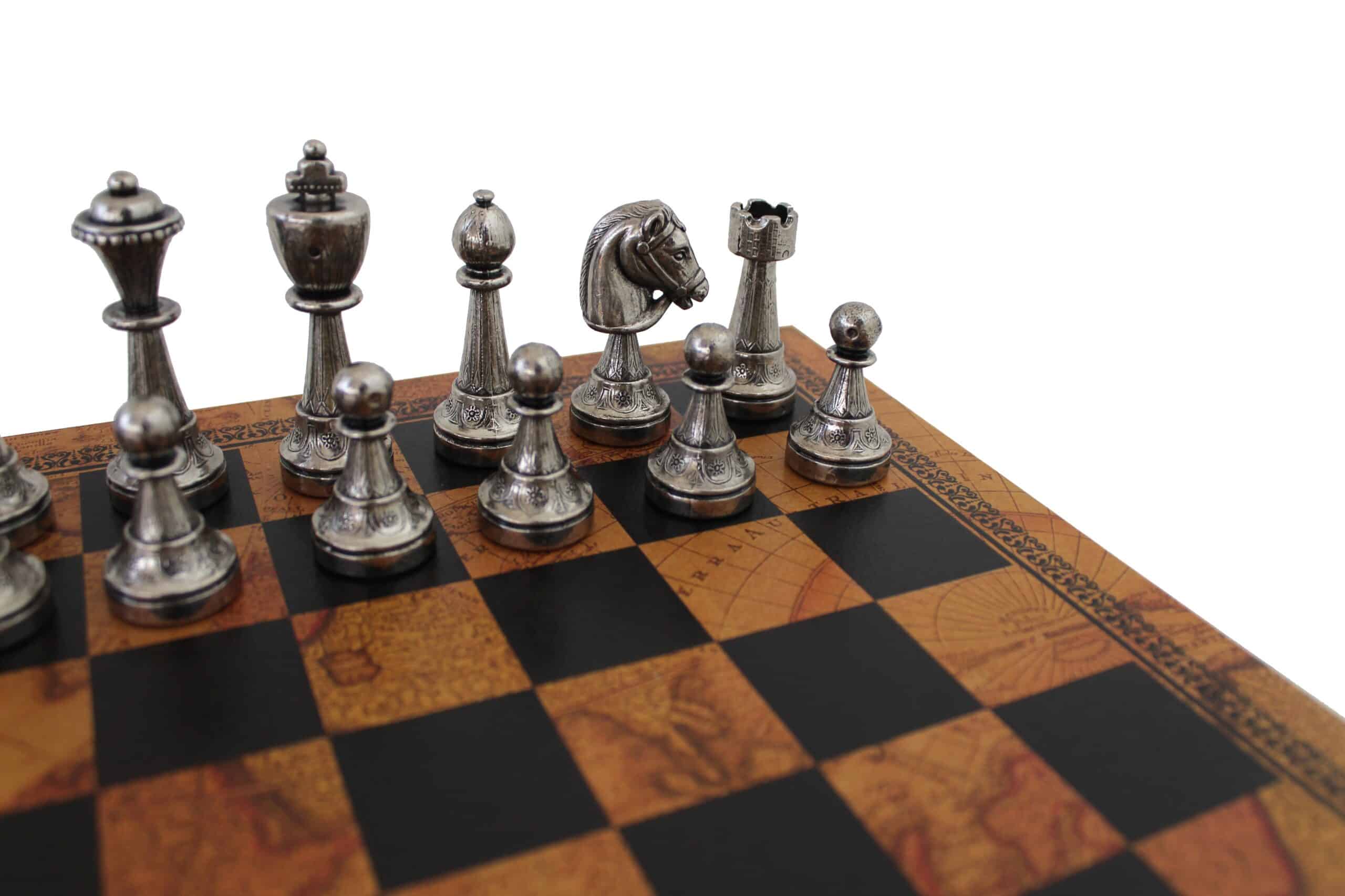 Staunton Schachspiel aus Metall & Schachbrett aus Kunstleder mit antikem Weltkartenmotiv