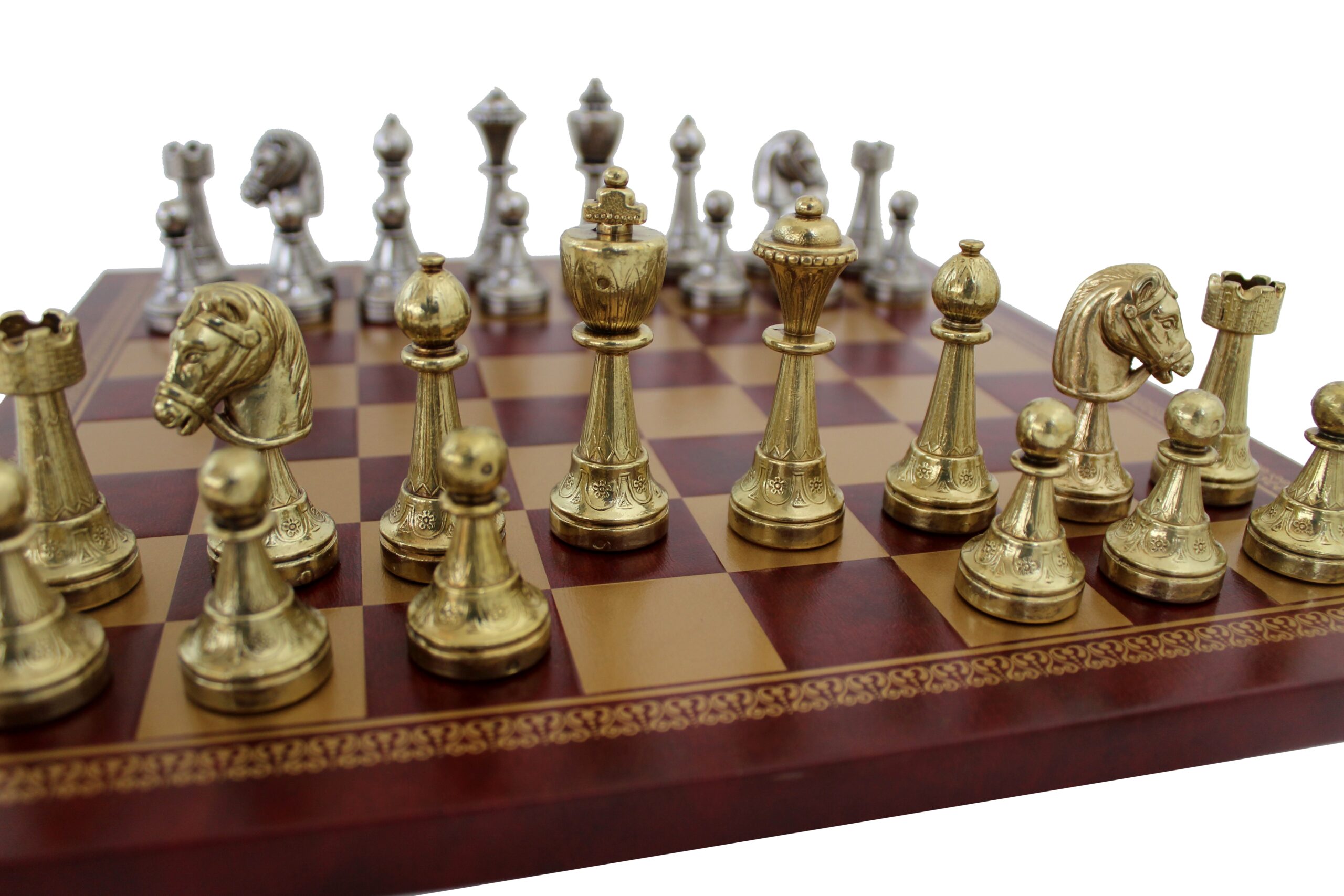 Staunton Schachspiel aus Metall & Schachbrett aus rotem / goldenem Kunstleder