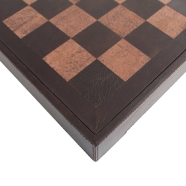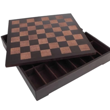 Das Schachbrett mit den Abmessungen 40 x 40 cm besteht aus echtem italienischem Leder und ist handgefertigt. Es bietet unter dem Spielbrett einen individuellen Stauraum für jedes Stück.