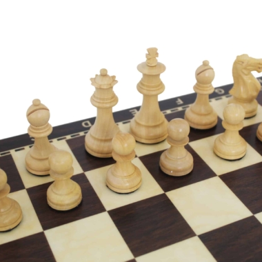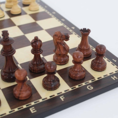 Ein klassisches Schachspielset mit einem Schachbrett aus MDF-Holz von 40 x 40 cm, das mit einer alphanumerischen Markierung ausgestattet ist.