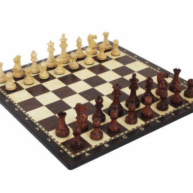 Ein klassisches Schachspielset mit einem Schachbrett aus MDF-Holz von 40 x 40 cm, das mit einer alphanumerischen Markierung ausgestattet ist.