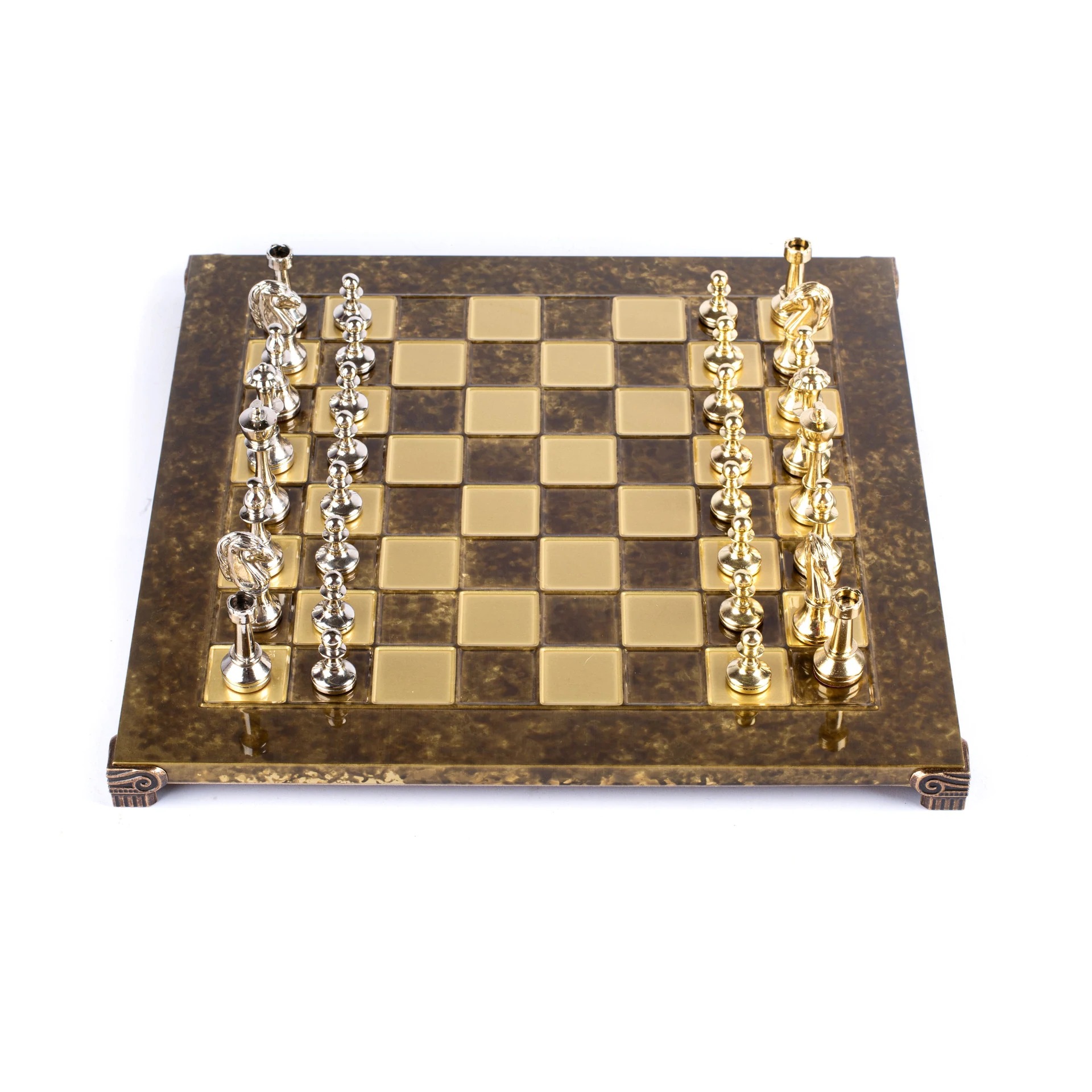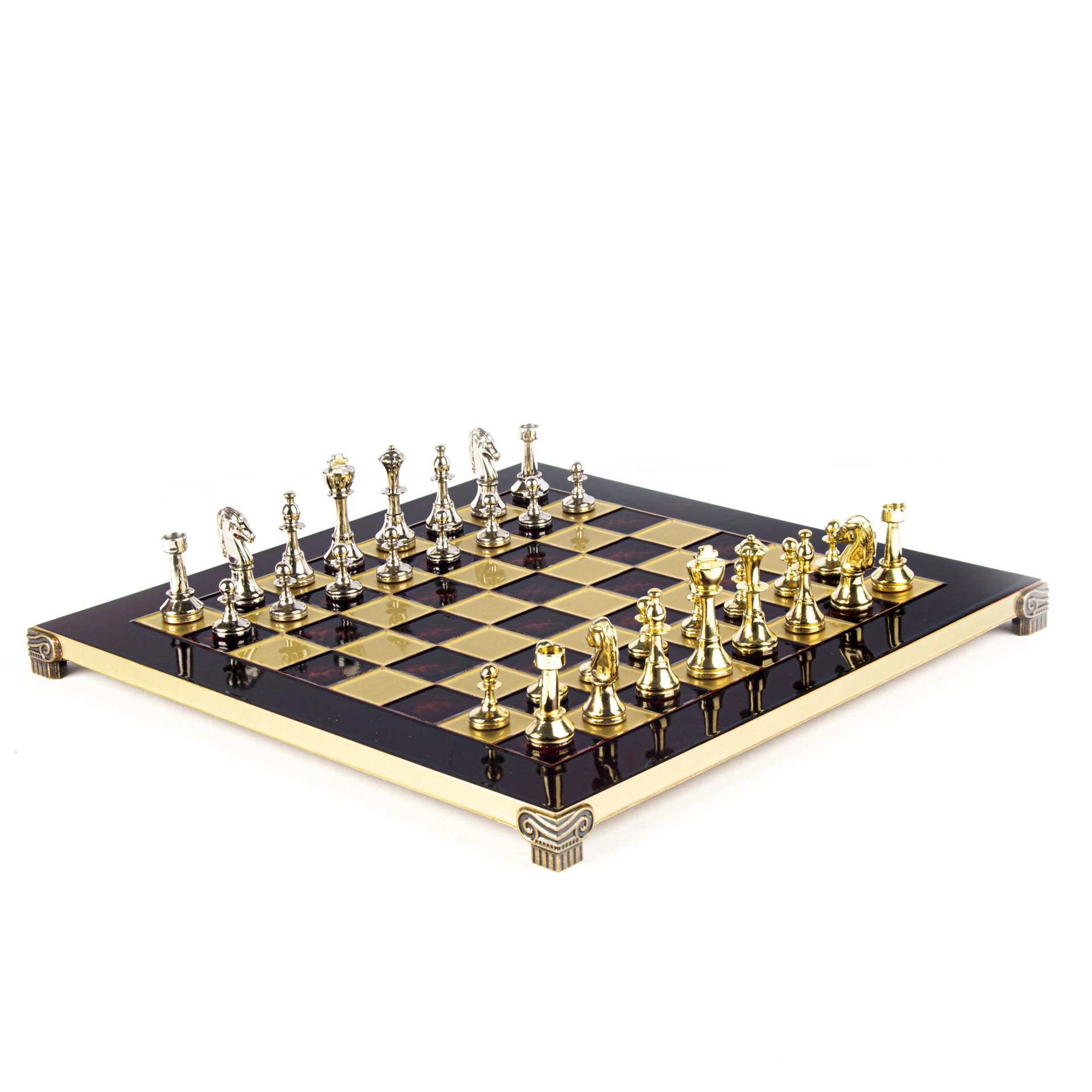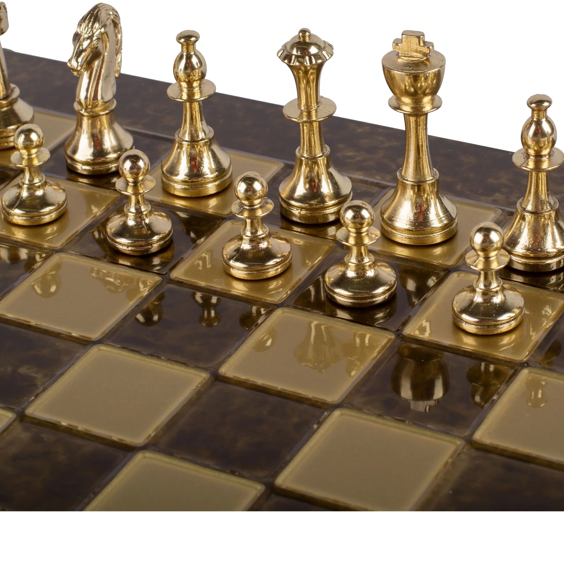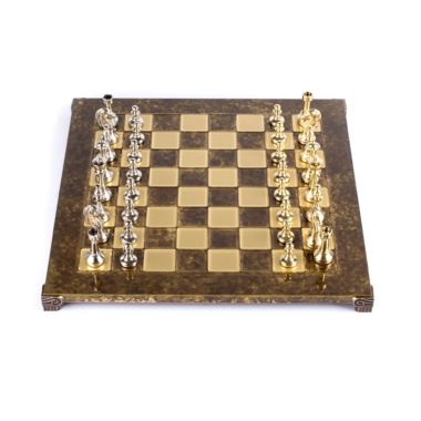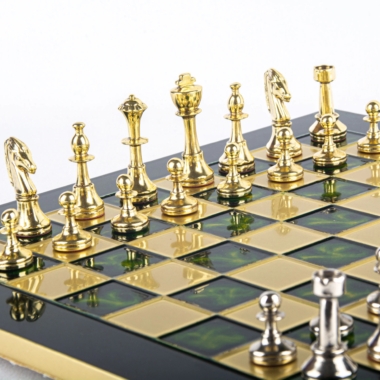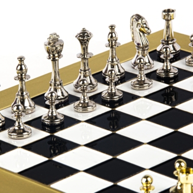 Die Staunton Schachfiguren aus gold- und silberfarbenem Metall sind fein gearbeitet und messen 6,3 cm Höhe für den König.