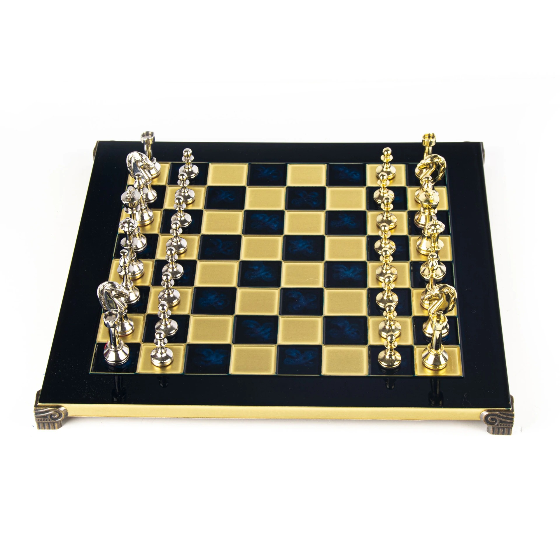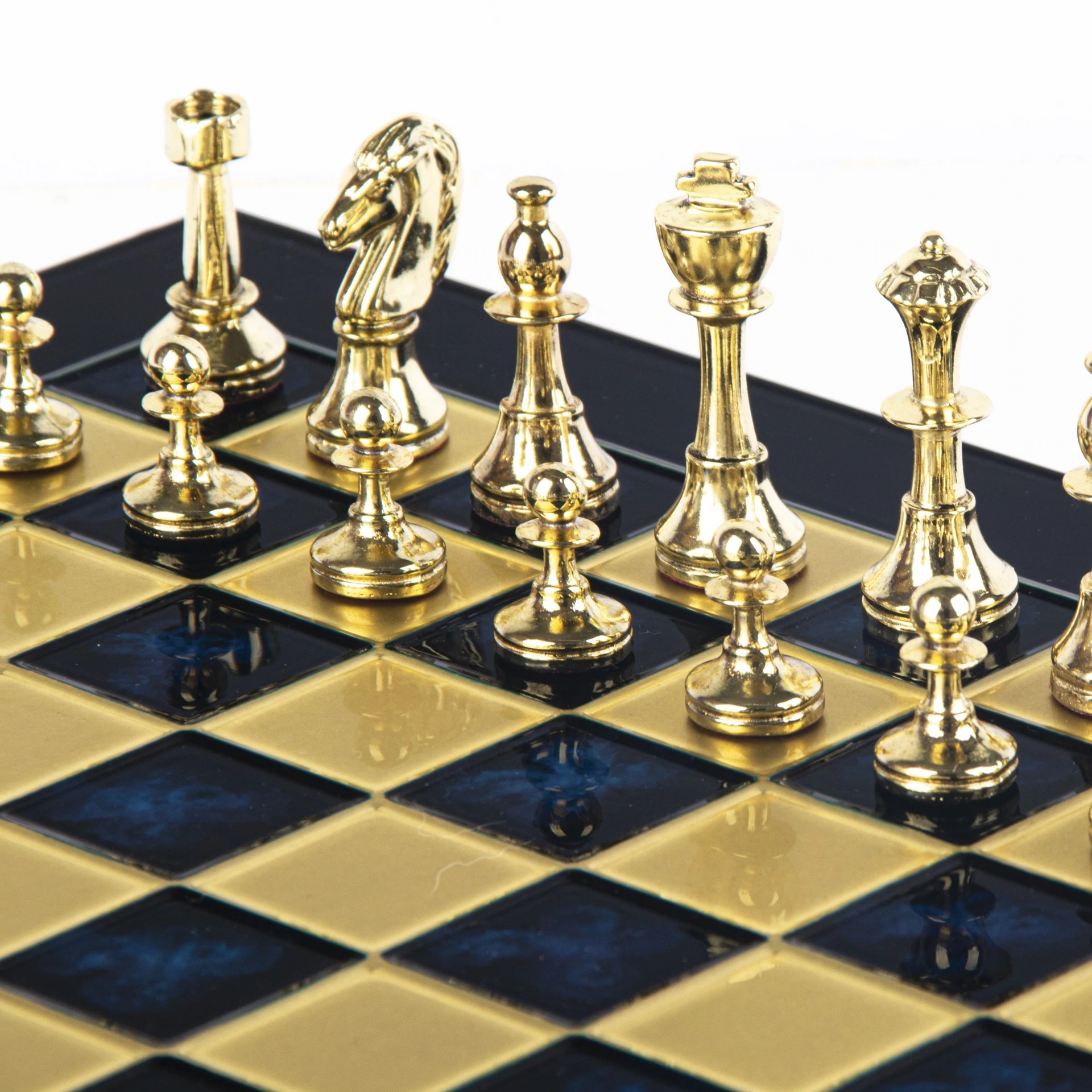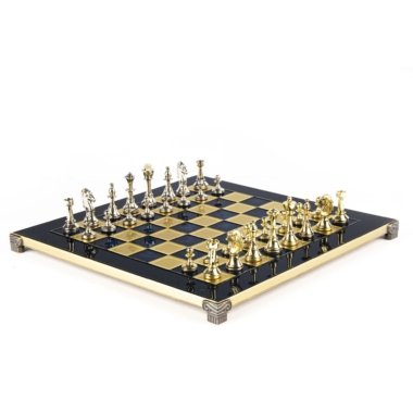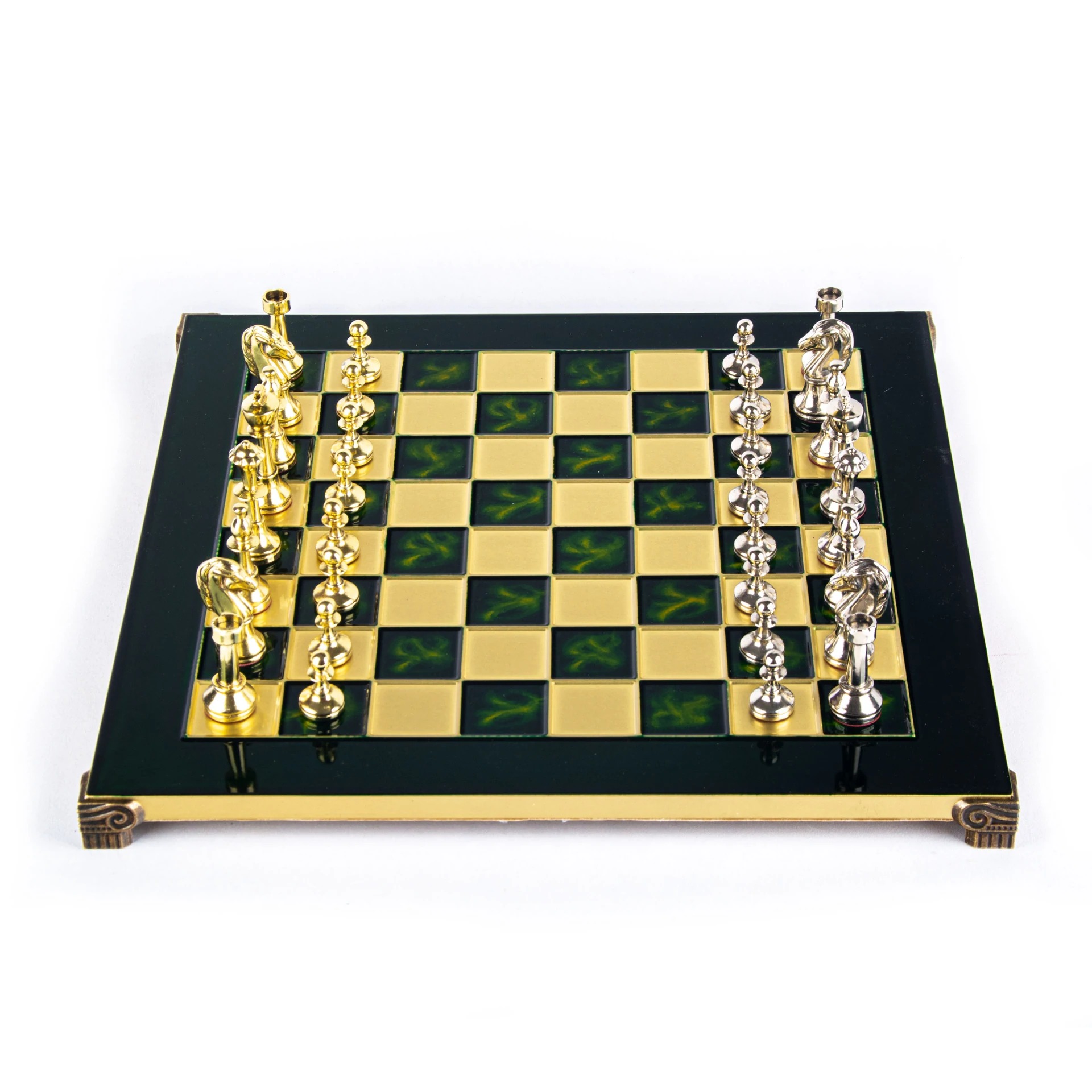 Die Staunton Schachfiguren aus gold- und silberfarbenem Metall sind fein gearbeitet und messen 6,3 cm Höhe für den König.