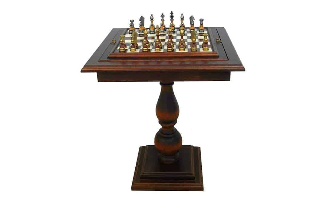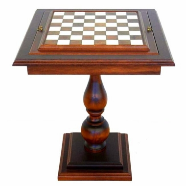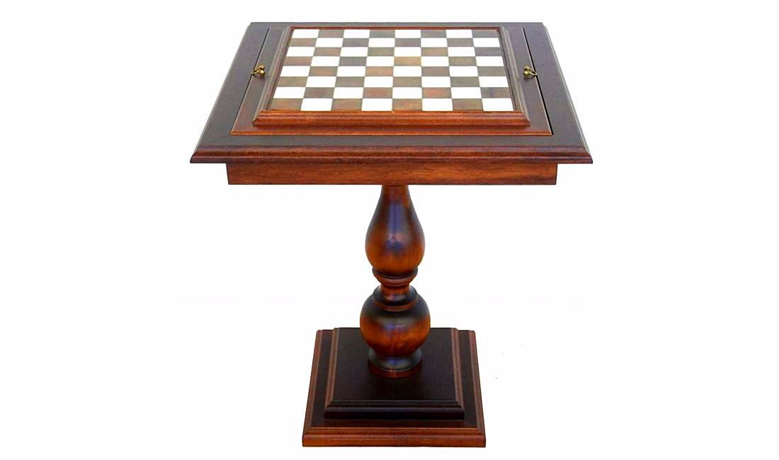 Der quadratische Schachtisch mit einem Fuß, dessen Ständer und der Rand des Schachbretts sind aus massivem Buchenholz geschnitzt. Die Spielfläche besteht aus einer Kombination von Carrara-Marmor und toskanischem Alabaster.