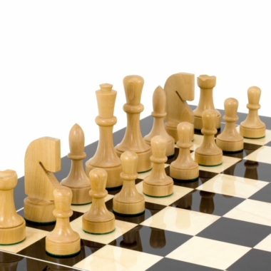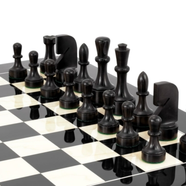 Die hochglänzende Lackierung des Schachbretts aus schwarzem Anigre verleiht ihm ein modernes Design.