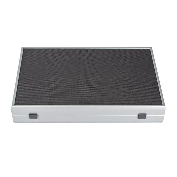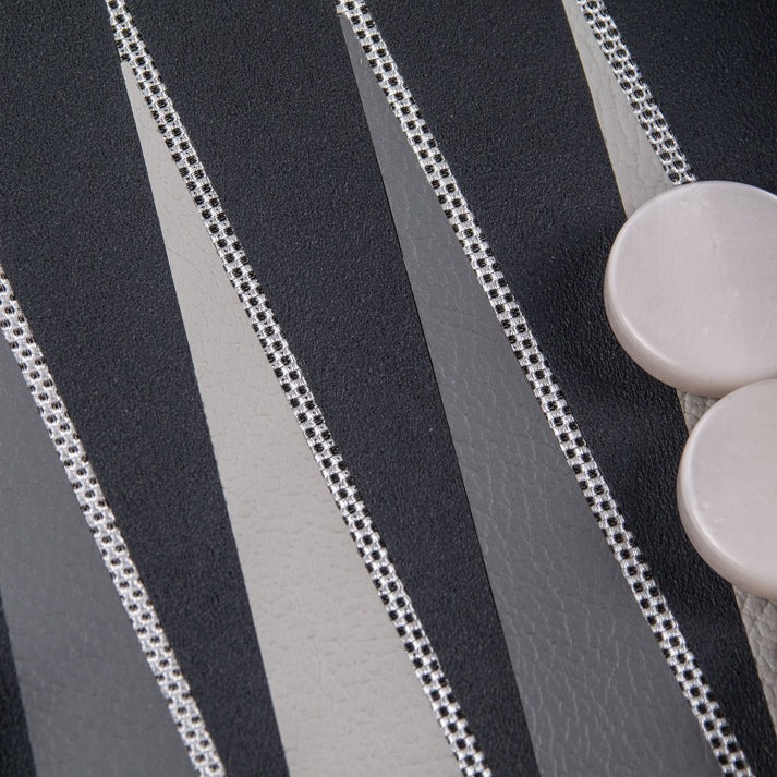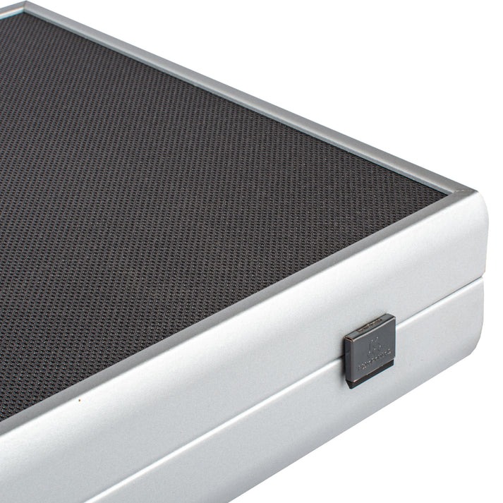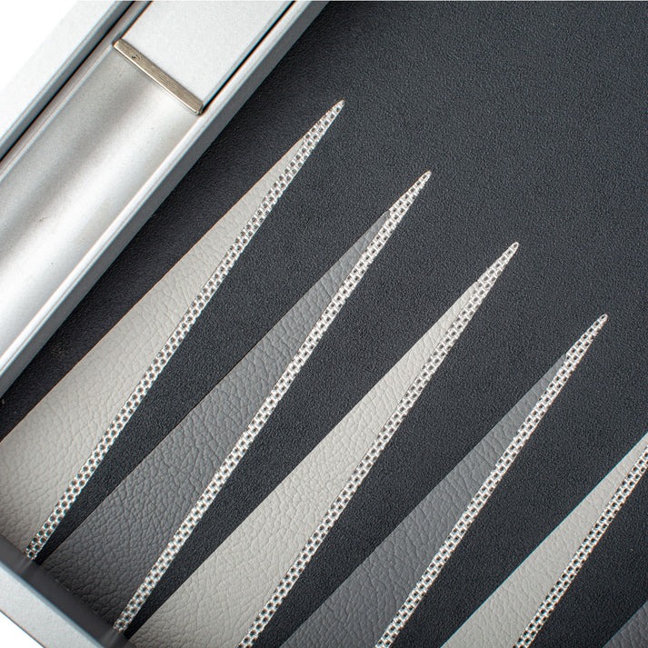 Dieses Set zeichnet sich durch sein Spielbrett aus Kunstleder aus, das eine sowohl elegante als auch langlebige Spieloberfläche bietet. Die Außenseite, ebenfalls aus Kunstleder, zeigt eine silberne Gitterstruktur, die dem Set ein modernes und raffiniertes Aussehen verleiht.